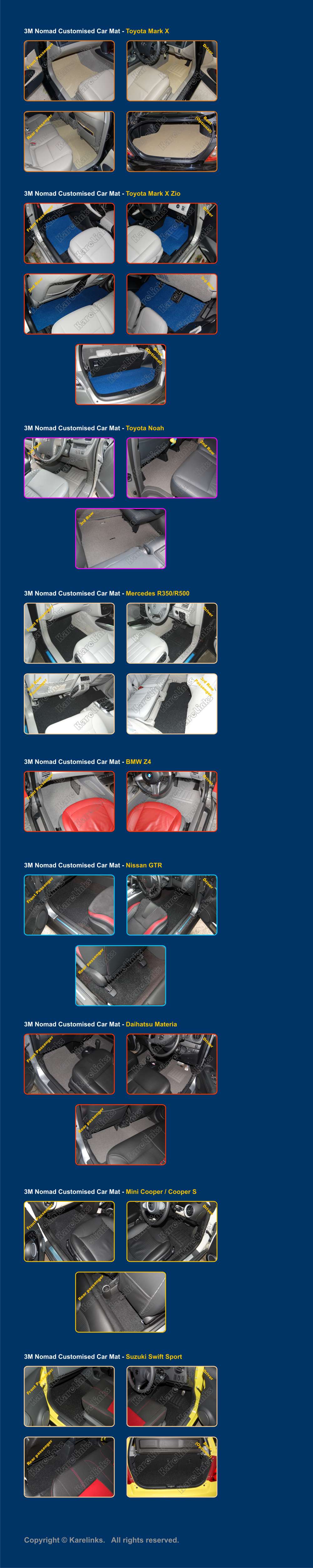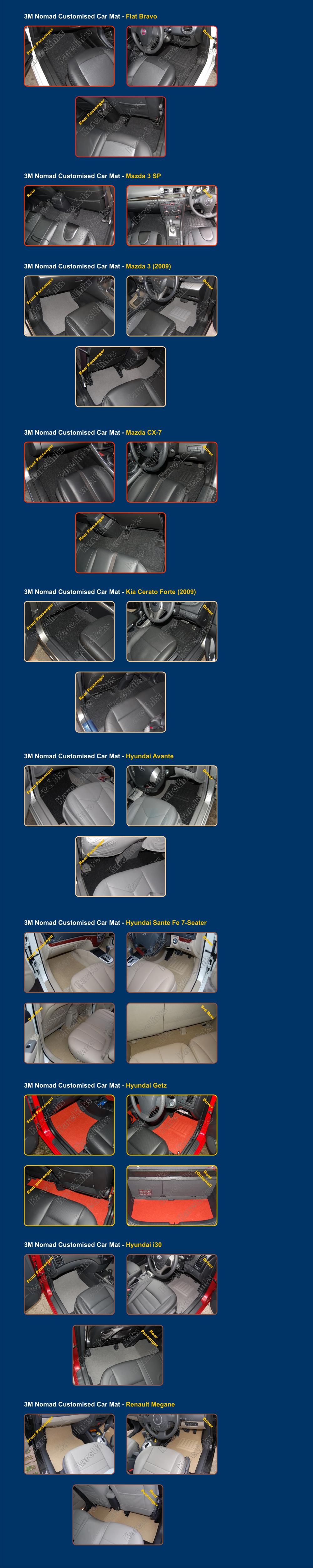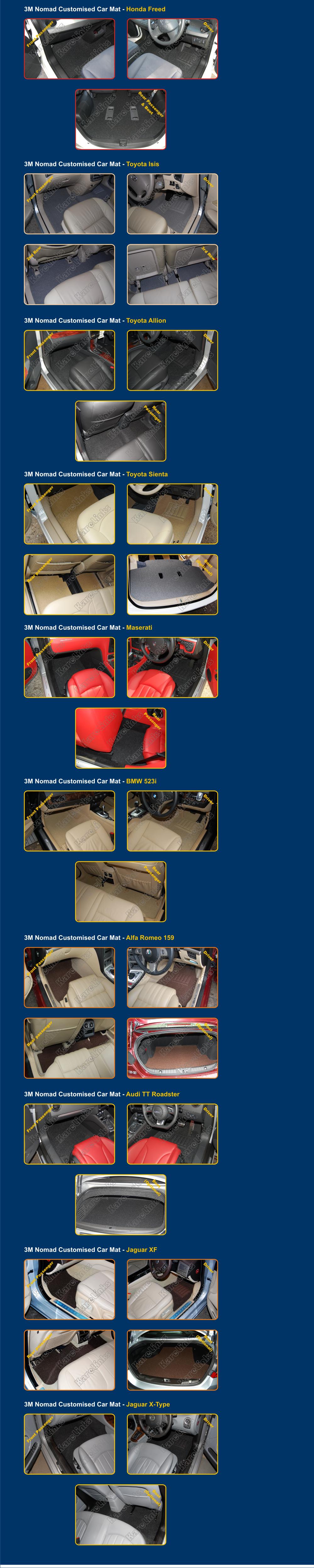 We customise 3M Nomad car mats with homogeneous heel plate and grippers for Alfa Romeo, Audi, BMW, Chery, Chevrolet, Chrysler, Citroen, Daihatsu, Dodge, Ferrari, Fiat, Ford, Honda, Hyundai, Jaguar, Kia, Lamborghini, Lexus, Lotus, Maserati, Mazda, Mercedes-Benz, Mini, Mitsubishi, Nissan, Opel, Perodua, Peugeot, Porsche, Proton, Renault, Rolls-Royce, SAAB, Ssyangyong, Subaru, Suzuki, Toyota, Volkswagen VW, Volvo, etc