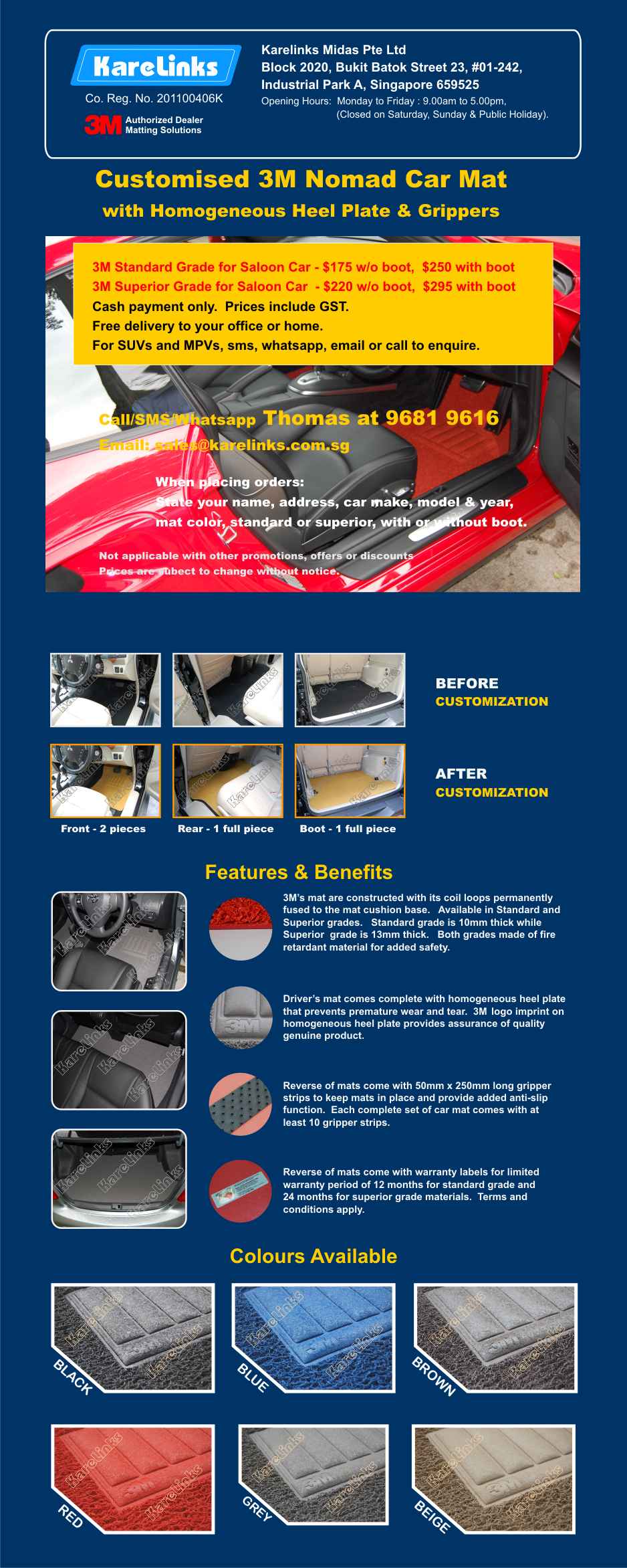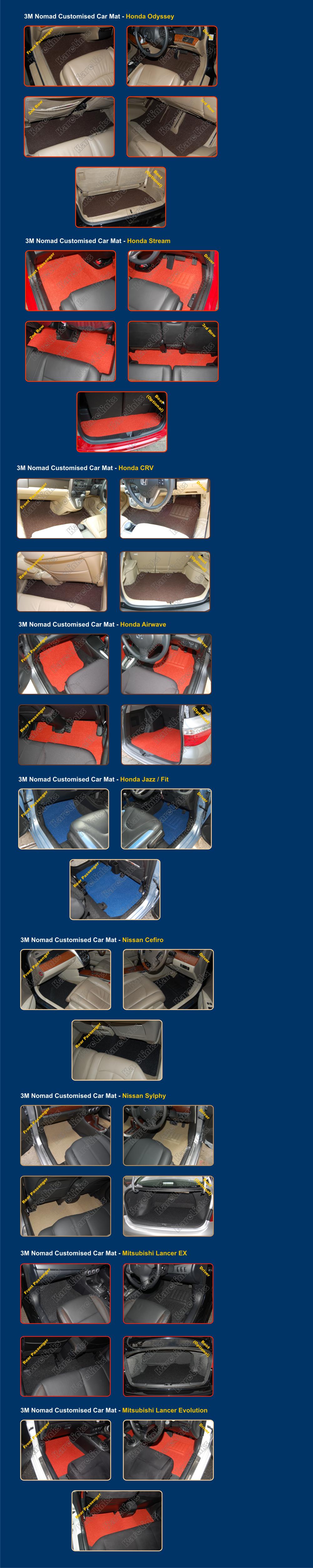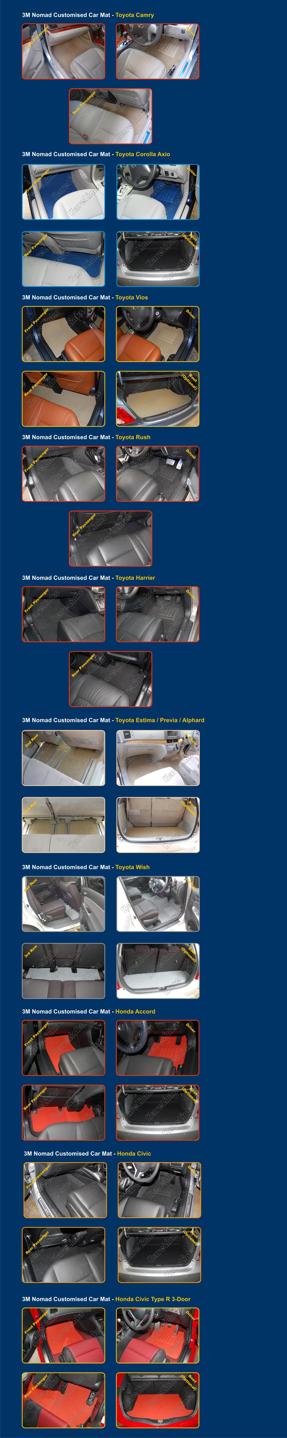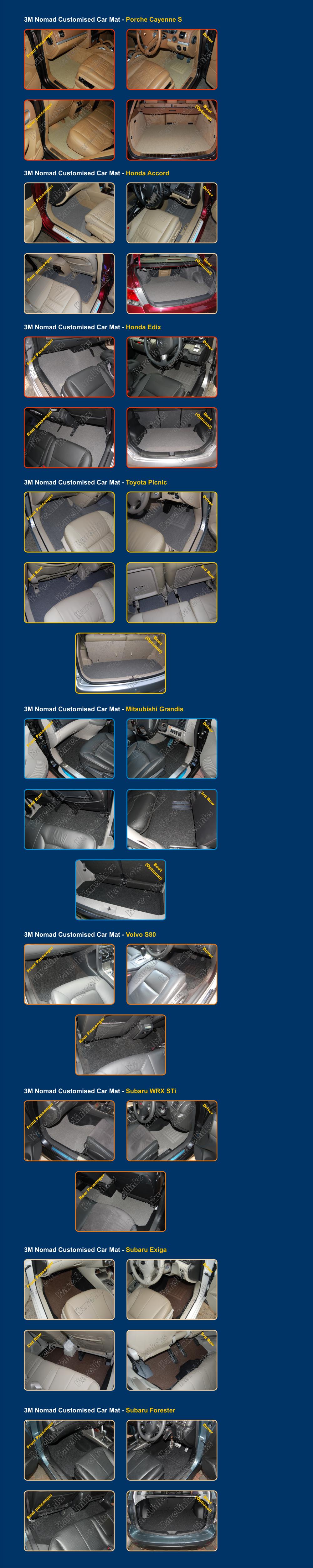 We customise 3M Nomad car mats with homogeneous heel plate and grippers for Alfa Romeo, Audi, BMW, Chery, Chevrolet, Chrysler, Citroen, Daihatsu, Dodge, Ferrari, Fiat, Ford, Honda, Hyundai, Jaguar, Kia, Lamborghini, Lexus, Lotus, Maserati, Mazda, Mercedes-Benz, Mini, Mitsubishi, Nissan, Opel, Perodua, Peugeot, Porsche, Proton, Renault, Rolls-Royce, SAAB, Ssyangyong, Subaru, Suzuki, Toyota, Volkswagen VW, Volvo, etc